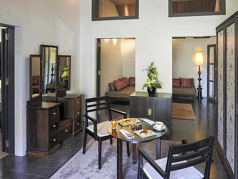 This villa features a decoration of Lao silk and artifacts. A garden with a private plunge pool is included. Bathrooms come with a rain shower, bathtub, and dressing area.